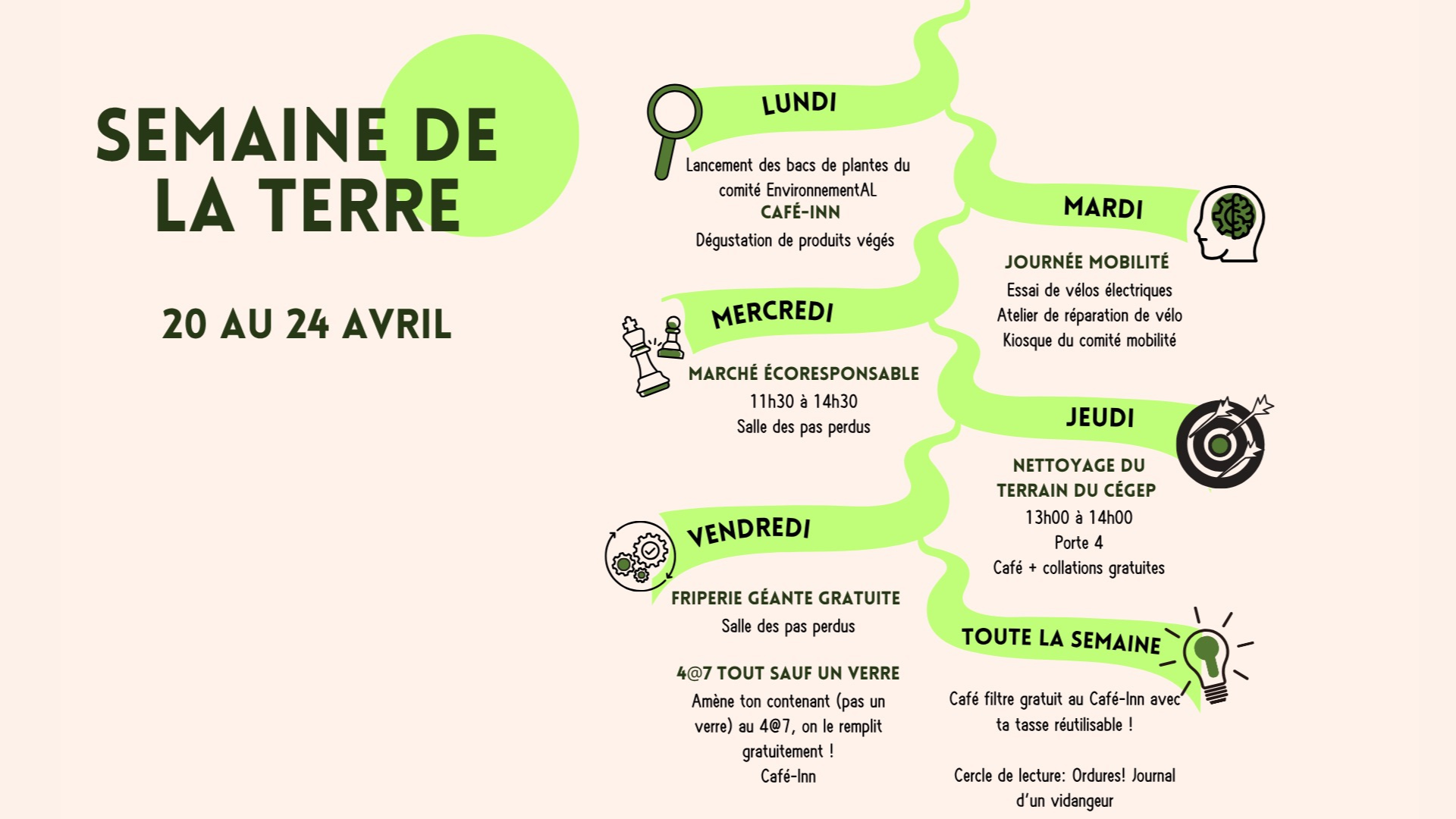 Joignez-vous à nous au Café-Inn à midi pour l’inauguration des bacs de plantes du comité environnementAL du Cégep. Après plusieurs mois de travail sur ce projet, les personnes étudiantes, membres du comité, ont hâte d’en faire le dévoilement à la communauté. Profitez-en pour prendre un café filtre au Café-Inn avec votre tasse. Le café filtre sera gratuit tout au long de la semaine (dans un récipient réutilisable).